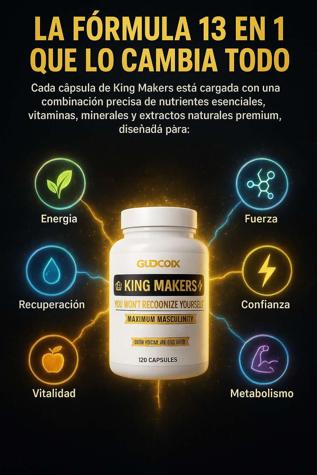 King Maker Elite es un suplemento 13 en 1 diseñado para potenciar energía, fuerza, recuperación y virilidad con ingredientes veganos y sin gluten.